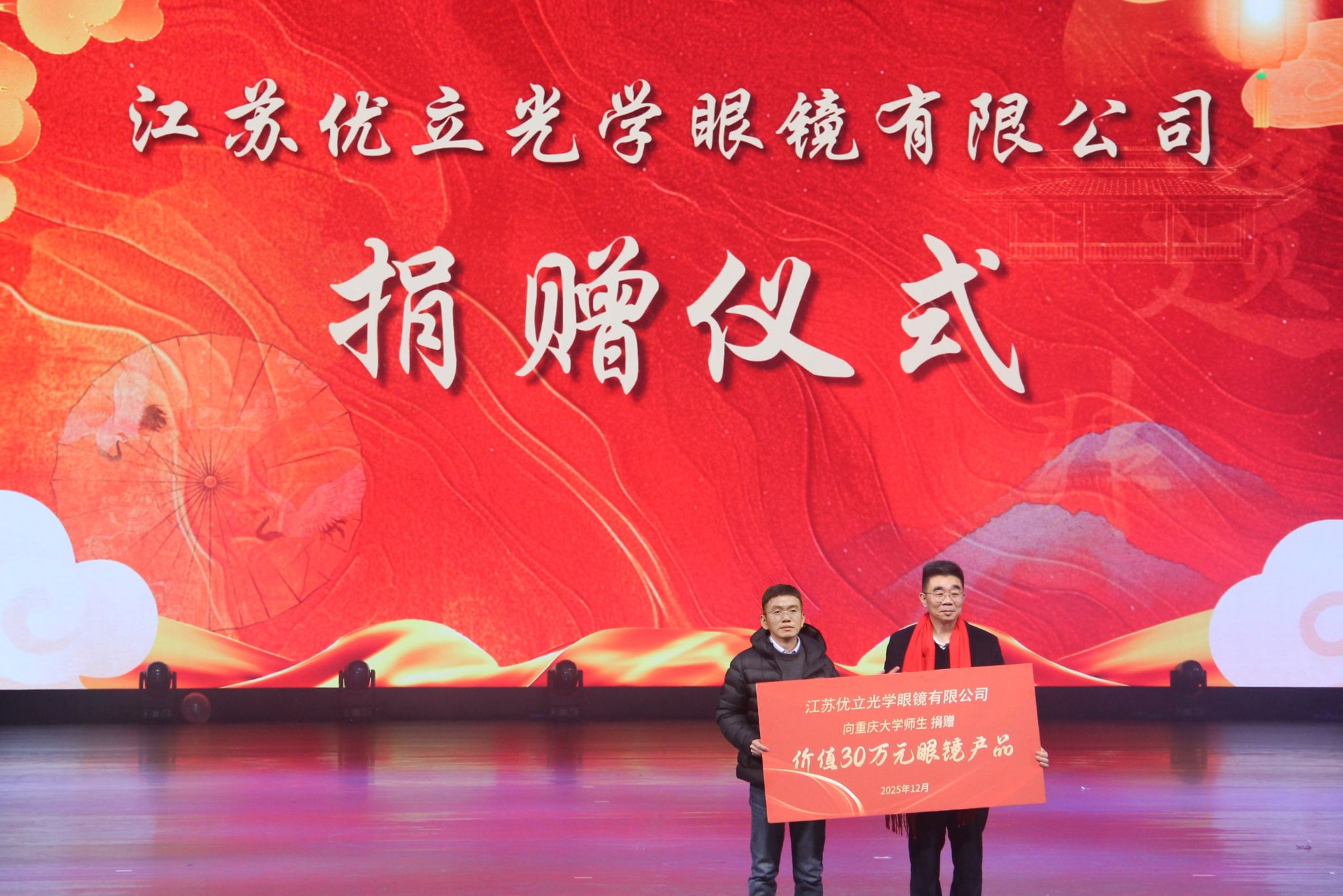 晚会现场还穿插着暖心公益与惊喜互动:江苏优立光学眼镜有限公司向重庆大学捐赠价值三十万元的眼镜产品,公司经理何明明与受赠代表韩忠教授共同留影,见证这一践行社会责任的温馨时刻;华为系列产品抽奖环节悬念迭起,十位幸运师生喜获殊荣,让现场氛围持续升温。